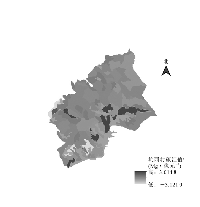 根据模型得出:坑西村2009年的碳储量为1.716 9×105Mg,2014年的碳储量为1.894 9×105Mg,5 a间的碳汇量达到1.780 3×104Mg,5 a间坑西村的碳储量空间动态分布图如图 5所示。图 5中,最大减少碳储量的值为3.121 0 Mg·像元-1;增加碳储量的值为3.014 8 Mg·像元-1。