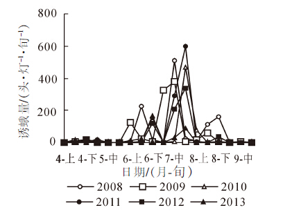 2008-2013年枇杷黄毛虫灯下成虫诱集量监测结果(图 1)显示:2008年以来,枇杷黄毛虫种群动态特征和数量结构发生了一定的变化:一是越冬代成虫始见期年度间差异较大,其中2008年、2009年和2013年成虫始见期较早,均为4月中旬,以2013年最早(4月14日),2010-2012年相对较迟。二是主害代灯下成虫峰期时间、蛾量年度间有差异,总体均以第3代峰期诱蛾量最高,其次为第2代;峰期持续时间、蛾量受当年气候等条件的影响呈相应的变化,2008年和2009年于7月中旬出现全年诱蛾最高峰,2010-2013年诱蛾最高峰出现在7月下旬;主害期危害程度年度间差异大,2011年7月下旬诱蛾量596头·灯-1·旬-1,与历年同期比第3代成虫峰期蛾量明显偏高,占全年诱集总量的55.18%,2013年7月高峰期蛾量为87头·灯-1·旬-1,明显低于历年同期,分析其原因可能与当年夏季出现罕见高温干旱天气,不利于枇杷黄毛虫生长发育有关。有研究表明:气候较为暖湿的条件下成虫产卵量多、幼虫发生量大[6],低于20 ℃和高于32 ℃的温度条件下对枇杷黄毛虫世代存活率不利[12],7月和8月干旱对黄毛虫的发生有抑制作用[6],也印证了这个可能性;第4代成虫诱集量普遍下降较快,可能与第3代幼虫发生期正值高温天气、成虫在高温下产卵少、卵孵化率下降使幼虫虫量不高有关。