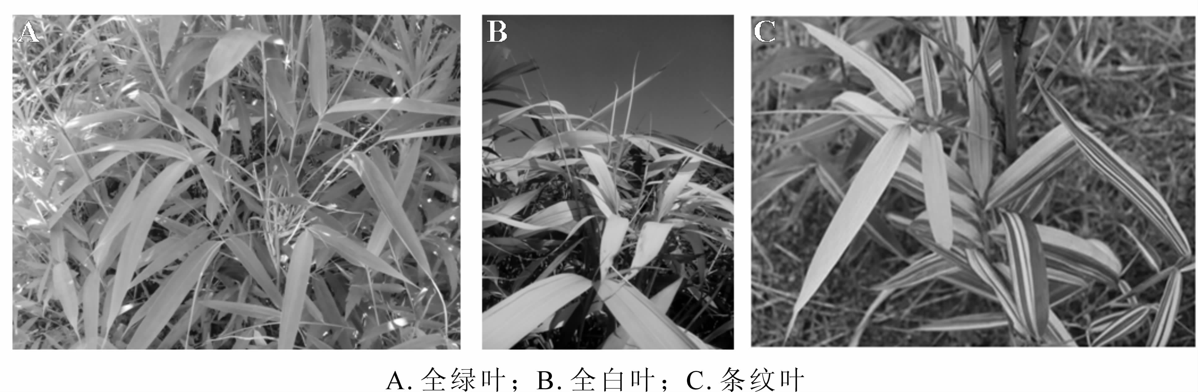 根据花叶矢竹叶片颜色的不同,可将其叶片分成3种形态:全绿叶、全白叶和花叶。全绿叶是整张叶片都是绿色的(图 1A);整张叶片都是白色的叶片是全白叶(图 1B);花叶是一张叶片上既有绿色也有白色,绿白相间,但是有的花叶绿色部分多于白色部分,就形成了白条纹叶,而有的花叶白色部分多于绿色部分,就形成了绿条纹叶(图 1C)。