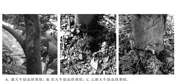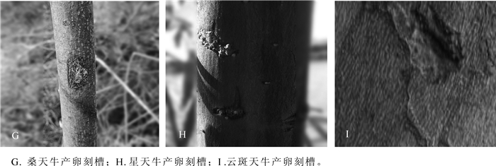 特征 桑天牛 星天牛 云斑天牛 幼虫排粪状 幼虫每隔一段距离就咬一排粪孔,最多具有十几个排粪孔。 幼虫在树干基部地面排出土堆状的虫粪。 幼虫危害后,树皮向外鼓起纵裂,虫粪为粗木丝状,常堆满整个地面。 幼虫蛀道 蛀道通直且伴随发酵的酒糟味。 蛀道从干基部一直延伸到根部。 蛀道内部呈黑色。 产卵刻槽 回形针型。 “T”字型。 唇形。 表 4不同天牛成虫雌雄鉴别特征