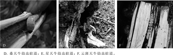 调查结果显示:不同天牛幼虫在山核桃树上表现出不同的危害症状,如排粪状、蛀道和产卵刻槽特征(表 3,图 1,图 2和图 3)。