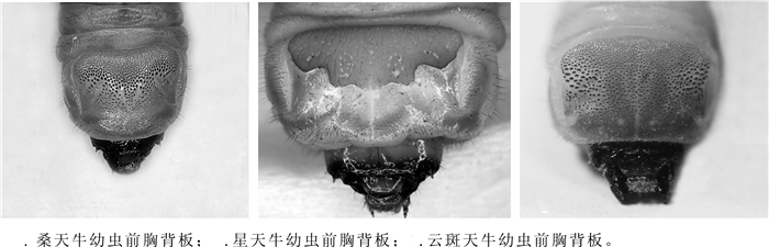 在3个试验样地中收集到的天牛幼虫通过用电子显微镜观察并拍照记录其前胸背板特征。通过比较发现,桑天牛、星天牛和云斑天牛幼虫前胸背板具有显著的形态特征:桑天牛幼虫的前胸背板具有放射线状瘤点,星天牛幼虫前胸背板前方有2个褐色飞鸟纹,云斑天牛幼虫前胸背板前方有2个小黄点。通过这些简易的形态特征可以很方便地识别这3种天牛幼虫(表 5和图 4)。