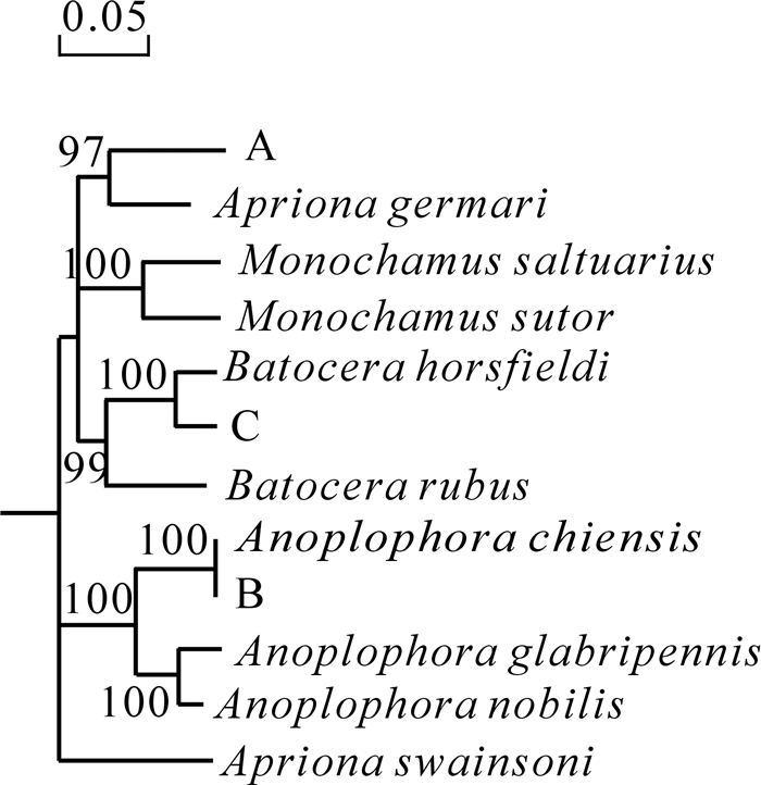 由图 5COI序列聚类结果显示:共比对了9种同属于沟胫天牛亚科常见天牛的COI基因序列,9种天牛分别属于粒肩天牛属Apriona,星天牛属Anoplophora,白条天牛属Batocera和墨天牛属Monochamus。经COI基因鉴定,其结果如下:上述A天牛幼虫基因比对为桑天牛A. germari,上述B天牛幼虫基因比对为星天牛A. chinensis,上述C天牛幼虫基因比对为云斑天牛B. horsfieldi。从亲缘关系来看,桑天牛和云斑天牛的亲缘关系更近,而这2种天牛与星天牛的亲缘关系相对较远。COI基因鉴定结果与上述通过幼虫前胸背板特征区分不同天牛幼虫的结果相一致,说明通过幼虫前胸背板特征快速区分桑天牛、星天牛和云斑天牛幼虫种类的方法是准确的。