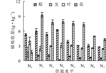 由图 6可知:不同供氮水平对钾吸收的影响,从N1开始‘橙香公主’植株钾质量分数以花为最高,茎最低。各处理间花的钾质量分数呈先上升后下降趋势,可以看出缺氮处理,不利于花对钾的吸收,低氮处理有利于钾向花内转移,在N1处理花钾质量分数达到最大值9.275 g·kg-1,其次为N3处理7.913 g·kg-1,N0处理时为最小值1.753 g·kg-1。茎的钾质量分数在N0处理达到最大1.748 g·kg-1,N3处理为最小值0.195 g·kg-1,随着供氮水平的增加,茎的钾质量分数呈现先下降后平缓上升趋势,处理间无不明显差异。根部钾的质量分数在N0~N3之间变化不大,N3~N7下降趋势,在N3处理达到最大值6.191 g·kg-1,且N3与N4处理间变化明显。说明在一定范围低氮处理有利于根部钾的吸收。叶的钾质量分数N0处理为最大3.999 g·kg-1,N1~N7区间‘橙香公主’叶的钾质量分数差异不明显,随着供氮水平的增加,对叶部钾的吸收影响不大,氮过量不利于钾在花和根部的累积。