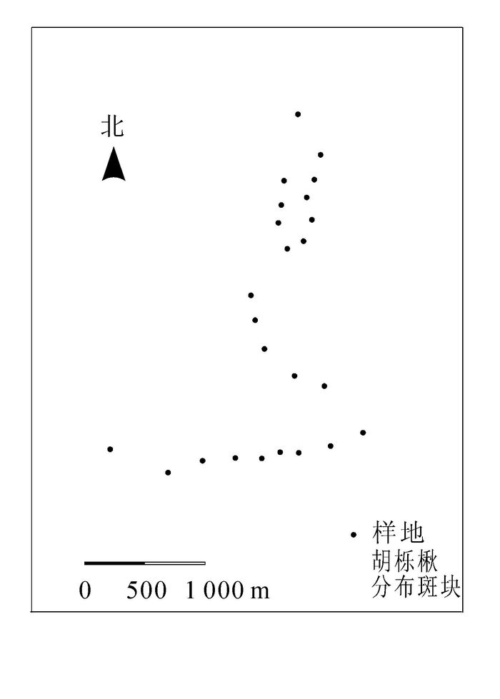 北京松山国家级自然保护区地处延庆县西北部,森林覆盖率接近90%。地处燕山山脉的军都山,坐标为40°29′9″~40°33′35″N,115°43′44″~115°50′22″E[12]。属于暖温带大陆性季风气候区,年平均气温为8.5 ℃,最高和最低气温分别为39.0 ℃和-27.3 ℃,年降水量与蒸发量分别为493.0 mm和1 772.0 mm,年平均日照时数为2 836.3 h。随海拔由低向高依次分布有山地褐土、山地棕壤和山地草甸土[12],土层厚度为20~55 cm。保护区总面积6 264.00 hm2。通过对调查数据的处理,在松山国家级自然保护区一共发现胡桃楸斑块65块,胡桃楸林总计为396.47 hm2。主要分布在大庄科村、兰角沟等地区的沟谷内阴坡一侧,海拔高度为700~1 500 m,以天然纯林为主,萌生情况普遍,少量伴生黑枣Diospyros lotus,榆树Ulmus pumila和大叶白蜡Fraxinus rhynchophylla等。林龄组成以中龄林为主,成熟林和近熟林次之,幼龄林最少。