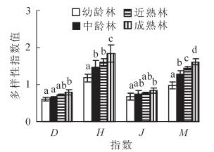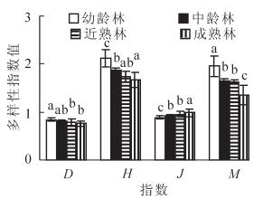 图 2不同林龄胡桃楸林下灌木层物种多样性指数