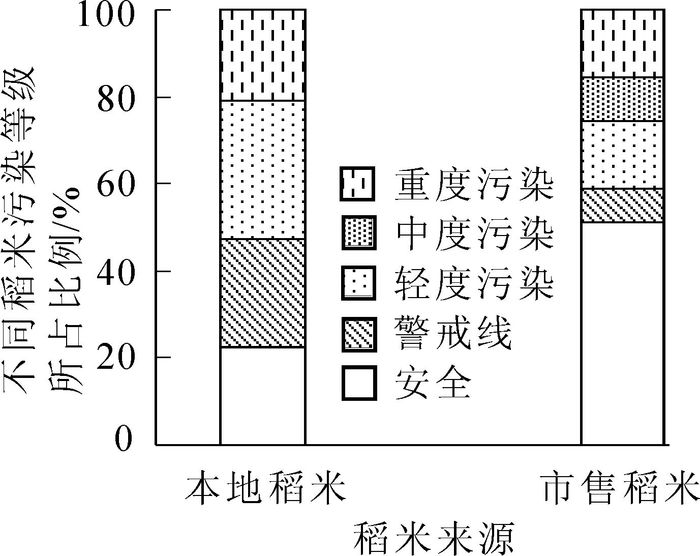 高虹镇本地稻米和市售稻米的平均综合污染指数分别为3.01和1.95,整体上分别处于重度污染和轻度污染的水平。不同等级稻米的分布见图 1。高虹镇本地稻米中,只有15.69%的稻米处于安全等级,29.41%的稻米处于警戒线,轻度污染的稻米占33.33%,没有中度污染的样品,但是有21.57%的稻米是处于重度污染的水平。高虹镇市售外地的稻米中,处于安全等级的稻米样品达到半数以上,为51.35%,在警戒线内的样品比例为8.11%,另有13.51%的轻度污染,中度污染为10.81%,16.22%的稻米处于重度污染的水平。
