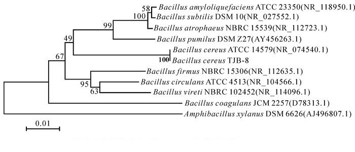 菌株TJB-8的16S rDNA PCR扩增得到一段大小约为1.3 kb的基因片段,回收测序后,测定的片段大小为1 258 bp,提交到GenBank,序列号为KX886805。用ClustalX和MEGA软件进行分析,Neibour-Joining法构建系统发育树(图 2)。该菌株与模式菌株Bacillus cereus ATCC14579相似度达100%。综合菌株TJB-8的形态学特征、生理生化特性及16S rDNA序列分析的结果,最终将菌株TJB-8鉴定为蜡样芽孢杆菌。
