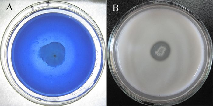 真菌细胞壁裂解酶特性的检测结果显示,只有β-1, 3-葡聚糖酶(图 3A)和蛋白酶(图 3B)的检测平板中菌体周围产生明显透明圈,而其他裂解酶检测平板中菌体周围未见透明圈或晕圈出现,表明TJB-8能产生β-1, 3-葡聚糖酶和蛋白酶,而不能产生几丁质酶、纤维素酶和脂酶。