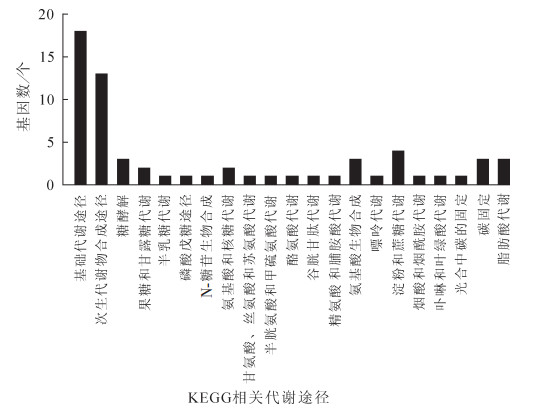 在4 ℃不同时间(0,2,6,12,24,48 h)处理下,EgrGATL1基因被强烈诱导,各处理时间下EgrGATL1的RPKM值分别为0.77,75.29,82.44,113.23,74.67和182.95。各处理时间点叶片中EgrGATL1的表达水平均为对照(0 h)的97倍以上。分析4 ℃不同处理时间下EgrGATL1共表达基因,选取其正向共表达基因90个(rco>0.90),负向共表达基因106个(rco>0.90),共196个基因进行KEGG分析。发现能与现有KEGG途径相匹配的基因有25个,其中参与基础代谢的基因18个,参与次生代谢物生物合成的基因13个(部分基因参与了1个以上的代谢途径)。这些KEGG途径包括各种糖相关代谢及合成途径,如糖酵解代谢,果糖和甘露糖代谢,半乳糖代谢,磷酸戊糖途径,氨基糖和核糖代谢,N-糖苷生物合成,淀粉和蔗糖代谢等;这些途径中包含11个基因。氨基酸代谢和生物合成途径如甘氨酸、丝氨酸和酸酸代谢,半胱氨酸和甲硫氨酸代谢,酪氨酸代谢,精氨酸和脯氨酸代谢,谷胱甘肽代谢以及氨基酸的生物合成等,包含8个基因。其他还包括嘌呤代谢,烟酸和烟酰胺代谢,卟啉与叶绿素代谢,碳固定与代谢以及脂肪酸代谢等(图 3)。尽管EgrGATL1高相关性共表达基因中,可用于KEGG分析的基因比例不高(12.8%),但仍能在一定程度上说明这些基因可能在代谢层面上主要参与糖代谢和氨基酸代谢,暗示这些代谢途径与EgrGATL1作用发挥具有一定协同性。
