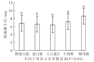 在最佳碳源确定的基础上,分别用胰蛋白胨、蛋白胨、大豆蛋白、牛肉粉、酵母浸粉代替培养基中的蛋白胨。结果(图 4)显示:抑菌实验的半径平均值分别为6.8,6.6,6.4,7.2和8.6 mm。当酵母浸粉作为氮源时,抑菌效果最为明显。由方差分析可知:酵母浸粉与其他的氮源有极显著差异(P<0.01),因此确定酵母浸粉为最佳氮源。