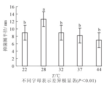 在适宜碳,氮源,C/N及pH值,无机离子正交试验结果基础上,根据培养基的营养条件,设计培养温度单因素多水平试验,分别调节初始温度为22,28,32,37,44 ℃,重复5次·水平-1,采用管碟法测定抑菌活性确定最适温度。