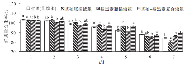 从图 2可以看出:瓶插期间,各处理切花月季鲜质量变化率均呈下降趋势;瓶插第1天,复合瓶插液组(基础+褪黑素)的鲜质量变化率最低,与对照达显著差异(P<0.05);瓶插第2~4天,褪黑素瓶插液组鲜质量变化率显著下降(P<0.05),其他各处理下降趋势不显著;在第5天时,基础瓶插液组和复合瓶插液组(基础+褪黑素)鲜质量变化率显著高于对照和褪黑素瓶插液组(P<0.05);在瓶插后期,各处理鲜质量变化率呈下降趋势,复合瓶插液组(基础+褪黑素)鲜质量变化率高于其他处理,且差异达显著水平(P<0.05)。