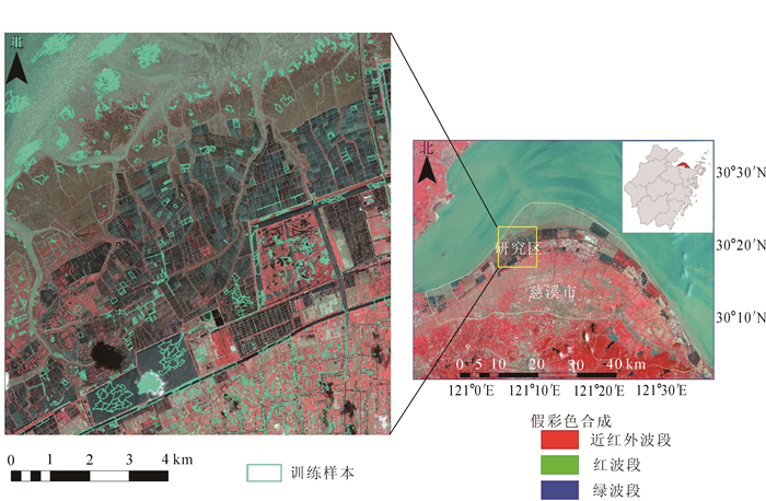 杭州湾滨海湿地类型以浅海水域和潮间淤泥海滩为主。研究区(30°16'32.98"N ~30°21'59.99"N,121°4'36.91"E~121°10'52.05"E)是杭州湾南岸滩涂淤涨最快的区段之一,也是围垦利用最为突出的区段之一。该区域湿地具有调节气候、净化环境、调蓄洪水、保护海岸线和维护生物多样性等多种生态功能[15](图 1)。研究区主要土地利用类型有耕地、水体、不透水地表、田埂等;湿地植被主要有芦苇Phragmites communis,海三棱藨草Scirpus mariqueter,互花米草Spartina alterniflora,南方碱蓬Suaeda australis等[16]。