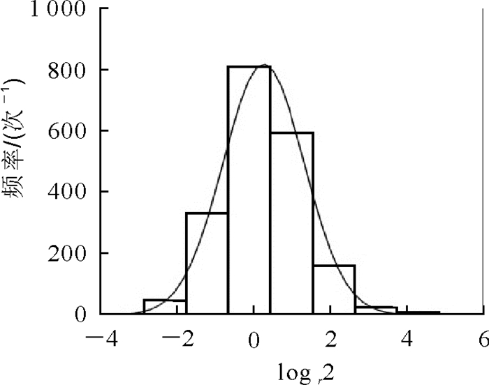 对获得的335 659个(‘六月雪’)和332 280个(‘黄皮消’)nsSNP进行常见变异分析发现,2个品种共有2 282个nsSNP关联了2 067个基因,nsSNP对基因的平均关联频率超过了1。其中,烟草花叶病毒耐药蛋白N(PCP017781),假定的抗病RPP13样蛋白1(PCP007357),可能的抗病RPP8样蛋白2(PCP030706),可能的LRR类受体丝氨酸/苏氨酸蛋白激酶At3g47570(PCP021305),未注释蛋白1(PCP008176),烟草花叶病毒耐药蛋白N(PCP007457),烟草花叶病毒耐药蛋白N(PCP018815),未注释蛋白2(PCP021753),含重复锚蛋白的蛋白质At5g02620(PCP022078),烟草花叶病毒耐药蛋白N(PCP030478),抗病蛋白RGA2(PCP014224),可能的LRR类受体丝氨酸/苏氨酸蛋白激酶At1g53420(PCP031574),假定的抗病蛋白RGA3(PCP023580)等蛋白编码的基因则关联了10个以上nsSNP。为进一步研究候选基因的选择压力,对得到的2 067个基因的nsSNP与同义SNP的比值(nsSNP/synonymous SNP,r)进行考察,发现r的对数呈现正态分布(图 1),其值约为2,说明进化有一定的正向选择压力。