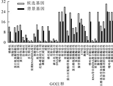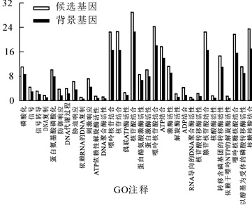 由于生物学定义混乱的原因,不同的生物学数据库可能会使用不同的术语。为了解决这个问题,基因本体联合会(Gene Onotology Consortium)建立了“基因本体论”(gene ontolog,GO)数据库,目的是通过利用统一化的、结构化的语言建立一个适用于不同物种的、对基因和蛋白质功能进行定义和描述,并且能够随着研究的不断深入而更新的语言词汇标准。GO数据库包含基因参与的生物过程、所处细胞位置及具有的分子功能3个方面信息,其注释信息可对基因功能进行预测。GO显著性富集分析以基因本体术语(GO term)为单位,确定差异表达基因行使的主要生物学功能。分析全局GO功能与候选基因所处的功能发现,刺激、结合反应等功能的基因相对于背景基因(1 306条)富集(图 2)。通过差异基因富集得到的GO terms(图 3及表 1)可知,全部25 698条信息中,ADP结合、蛋白酪氨酸激酶活性、腺苷核糖核酸结合、嘌呤核苷结合、核苷结合、腺苷核苷酸结合、防御反应、蛋白丝氨酸/苏氨酸激酶活性、转移酶活性、转运含磷基团、嘌呤核糖裂解键、核糖核酸结合、嘌呤核苷酸结合、蛋白激酶活性、RNA导向的DNA聚合酶活性、磷酸转移酶活性、醇基作为受体、DNA聚合酶活性、RNA依赖性DNA复制、翻译后蛋白质修饰、脯氨酸氨基酸、磷酸化、蛋白质改性过程等GO terms具有显著性意义。