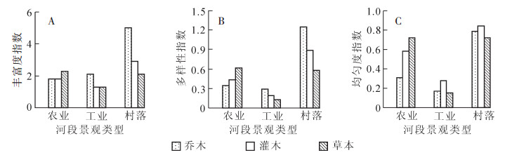从物种丰富度来看(图 3A),农业景观河段为草本(2.3) > 灌木(1.8)=乔木(1.8),工业景观河段为乔木(2.1) > 灌木(1.3)=草本(1.3),村落景观河段为乔木(5.0) > 灌木(2.9) > 草本(2.1)。从物种多样性来看(图 3B),农业景观河段为草本(0.61) > 灌木(0.43) > 乔木(0.34),工业景观河段为乔木(0.29) > 灌木(0.19) > 草本(0.13),村落景观河段为乔木(1.25) > 灌木(0.89) > 草本(0.58)。从物种均匀度来看(图 3C),农业景观河段为草本(0.72) > 灌木(0.58) > 乔木(0.31),工业景观河段为灌木(0.28) > 乔木(0.17) > 草本(0.15),村落景观河段为灌木(0.84) > 乔木(0.79) > 草本(0.72)。