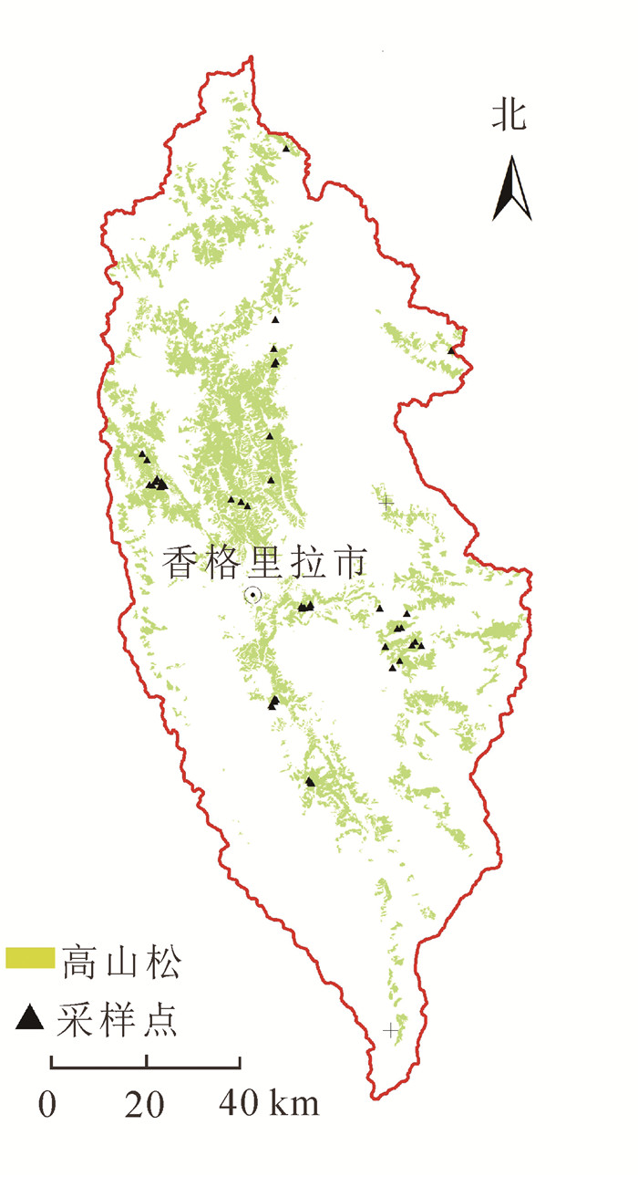 研究区位于滇西北迪庆藏族自治州香格里拉市境内(26°52′11.44″~28°50′59.57″N,99°23′6.08″~100°18′29.15″E)(图 1)。研究区地势高耸,热量不足,气温偏低,海拔为1 503~5 545 m,多年平均气温为5.5 ℃,历年平均降水量为618.4 mm,平均降雪日为35.7 d,年日照率为40%~50%,属山地寒温带季风气候。境内密集的金沙江水系支流、冰雪融水和高原湖泊等水资源以及以棕壤、红壤为主的森林土壤类型孕育了丰富的植物资源。森林植被面积大,覆盖率高,南北差异分布明显,主要分布有10种植被类型,常见的树种有云杉Picea asperata,冷杉Abies fabri,高山松,云南松Pinus yunnanensis和高山栎Quercus semicarpifolia等。其中,高山松适应性广,更新能力强,是喜光、耐旱、耐瘠薄的优势树种。一般分布于云杉、冷杉林下限,海拔为2 800~3 500 m,林分外貌整齐,成片分布,以同龄单层林常见,占全市乔木林面积的22.7%。