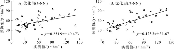 项目 B2 B2_3_ME B2_3_HO B2_3_DI B3_3_HO B3_3_DI B3_3_EN B3_3_SM B4_3_ME B2_5_ME B3_5_ME B3_5_EN B3_5_SM B4_5_ME B2_9_ME B3_9_ME 权重 2.10×l0-3 2.50×10-2 7.53×10-2 1.41×10-1 1.14×10-1 1.24×10-1 1.16×10-1 6.12×10-2 2.42×10-2 2.88×10-2 2.29×10-2 2.75×10-2 9.52×10-2 2.59×10-2 4.04×10-2 7.50×10-2 说明:Bi_N_T为纹理特征,即第i波段N×N窗口下的纹理滤波T。纹理滤波依次分为:均值ME,方差VA,协同性HO,对比度CO,相异性DI,信息熵EN,二阶矩SM,相关性CR。如B2_3_ME,即第2波段3×3窗口下的均值(ME)纹理滤波,依次类推 本研究的主要目标是通过优化方法降低像元尺度下模型的估测误差,提高对高山松地上生物量的估测精准度。表 6和图 5表明:(1)基于传统k-NN模型的样本生物量预测结果为16.2~92.6 t·hm-2,平均值为54.7 t·hm-2,模型均方根误差为30.0 t·hm-2, 偏差为-0.418 t·hm-2,RMSE为54.8%(图 5A);(2)遗传算法优化后的ik-NN模型精度得到了提升,均方根误差为24.0 t·hm-2,偏差为-0.123 t·hm-2,RMSE为43.7%(图 5B)。与传统k-NN模型相比,ik-NN模型的精度均方根误差值降低了约6.0 t·hm-2,偏差下降比例达75.6%,模型精度RMSE提高了11.1%;(3)ik-NN模型的样本估计值为23.3~95.2 t·hm-2,在均值上与实测值比较相近,约55.0 t·hm-2。但对于高生物量或低生物量区域的估测残差仍较大,均出现高值低估,低值高估的现象。