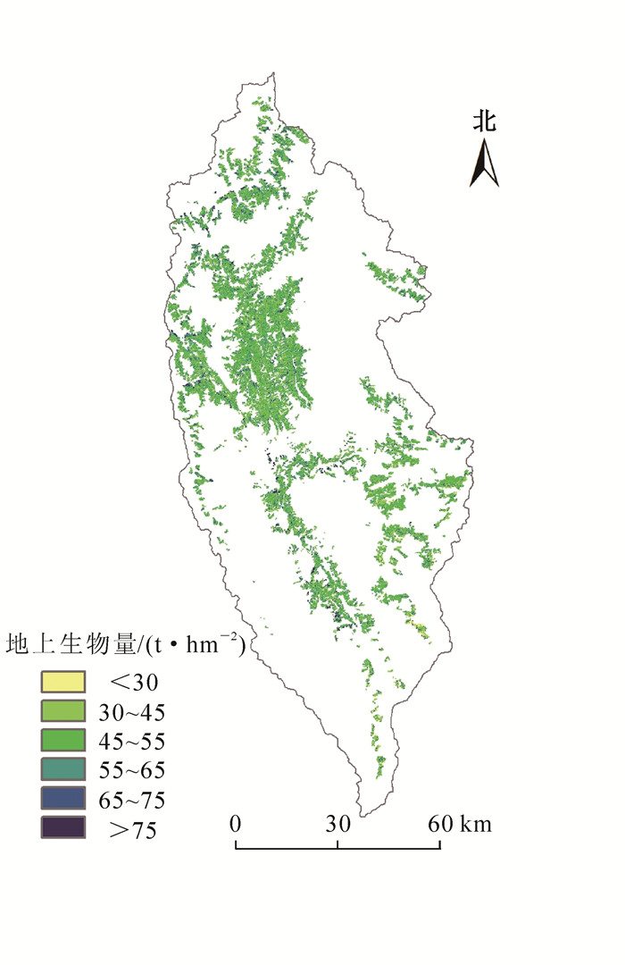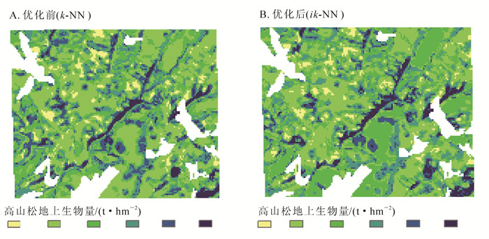 CHIRICI等[17]研究显示:使用卫星光谱数据作为特征变量时,需要大量的样本来获取较小的相对标准误差百分比,这与本研究结果相符合。本研究k-NN模型的参考样本偏少,且参考样本在空间分布上相对集中(图 1),所以生物量的预测结果残差较大,出现高值低估,低值高估的现象;造成这一现象的另一个原因是k-NN法本身存在的缺陷,即只能局限于实测值范围内对未知单元进行估测,预测值不会超出实测值的范围,模型算法中k个参考样本间的加权求和降低了估计值的方差,从而产生了更大的估测误差。但k-NN在大尺度区域上的森林资源监测中有很大的潜力,不仅适用于森林参数的估测反演,还适用于森林调查空间插值预测、数据库监测、小区域估测和统计推理等研究[19-20],并且从以下方面做出突破可以有效提升其预测能力,为生活生产实践提供更好的技术借鉴:①k-NN在搜索最近邻个体时应限制搜寻的范围,如限制一个搜寻半径或在指定的图斑区域,而不是全局搜索,充分利用区域化变量的特性来提高模型的估测精度。②利用地物光谱的差异性,结合星载、机载高光谱数据和地面实测高光谱数据或者其他能够区分地物的单波段,利用最近邻法或其他机器学习算法实现对地物的精细识别,提高区域尺度上的地物分类精度,进而提高对其生理生化参数定量估测的准确性。