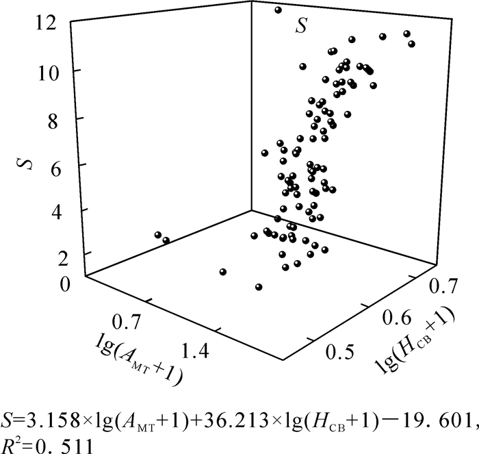 以林下舒适度作为因变量,平均叶倾角、冠层厚度、冠下高为自变量,进行逐步回归分析(图 3)。排除的变量为冠层厚度, 关系式各参数均达到显著水平(P<0.05),平均叶倾角和冠下高的协同作用对林下舒适度的解释程度为51.1%,相较单一结构指标有所提升[10]。