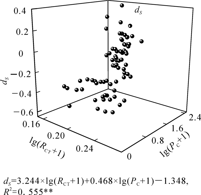 以舒适变化强度为因变量,冠高比和冠层通透度为自变量进行逐步回归分析(图 5),关系式各参数均达到显著水平(P<0.05)。冠高比和冠层通透度的协同作用对舒适变化强度的解释程度为55.5%。