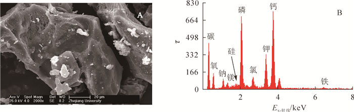 病死猪由浙江省湖州市某病死动物无害化集中处理中心提供。将整猪置于炭化炉中,650 ℃无氧、常压条件下热解4 h制备而得,标记为猪炭(pig biochar,PB);研磨粉碎后过20目和100目筛。生物质炭pH,EC和CEC采用IBI标准方法[17]测定;交换性阳离子采取乙酸钠浸提法测定[18];灰分采用ASTM D1762-84法测定[19];交换性钙、镁采用原子吸收分光光度计(FAAS-6880,日本)测定;生物质炭比表面积采用比表面分析仪(ASAP 2020M,美国)测定,并采用BET法测算生物质炭比表面积、BJH法测算生物质炭孔容和平均孔径;采用扫描电子显微镜(SEM-EDS)(S-3000N,日本)分析生物质炭的元素组成与表面形态结构;碳(C)、氢(H)、氮(N)元素质量分数采用元素分析仪(Flash EA1112 Thermo Finnigan,意大利)测定,差减法计算氧(O)元素含量;表面碱度采用返滴定法[20]测定;用氢氟酸-高氯酸-硝酸(HF-HCIO4-HNO3)法对生物质炭进行消煮,重金属质量分数采用原子吸收分光光度法[21]测定、全磷质量分数采用钼蓝比色法[17]测定。检测得到猪炭pH值为10.25;阳离子交换值为31.14 cmol·kg-1,其中交换性钾(K)、钙(Ca)、镁(Mg)分别为1.33,0.19,0.95 cmol·kg-1;灰分含量为58.42%,元素碳(C)、氢(H)、氧(O)、氮(N)、磷(P)、硫(S)质量分数分别为28.87,1.56,7.77,3.26,7.70和0.12 mg·g-1;比表面积为28.23 m2·g-1,孔容为0.12 cm3·g-1,平均孔径为3.78 nm。扫描电镜(图 1A)及能谱图(图 1B)如图 1所示。