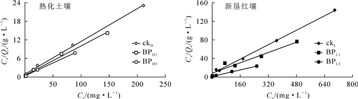 处理 pH CEC/(cmol·kg-1) ckH 6.01±0.01 d 5.10±0.13 e BPH1 6.18±0.02 c 8.33±0.40 c BPH5 6.48±0.02 a 13.37±0.25 a ckL 5.80±0.13 f 4.10±0.05 f BPL1 5.91±0.05 e 6.93±0.15 d BPL5 6.22±0.04 b 11.33±0.25 b 说明:不同小写字母表示处理间差异显著(P< 0.05) 表 3土壤对Pb2+的吸附等温模型参数
