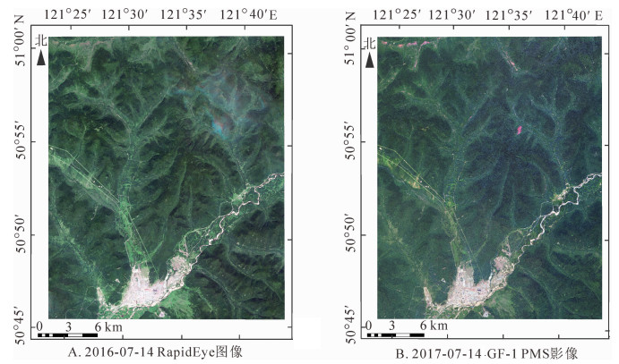 国产GF-1数据由中国资源卫星应用中心提供[11],RapidEye数据由高分辨率对地观测系统重大专项(民用部分)科研项目(21-Y20A06-9001-17/18)提供。数据详细信息见表 1。