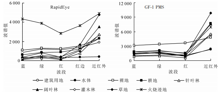 基于Rapid Eye和GF-1 PMS影像上8种地物类型的光谱特征(图 2),分析各类别在不同数据源、不同时相影像上的光谱差异和光谱域类别可分性。由图 2可知:RapidEye影像上红边波段(red edge,RE)处是植被光谱响应的转折点,差异性明显;GF-1 PMS影像上,针叶林、阔叶林、灌木林、草地和耕地在近红外波段(near infrared,NIR)表现出明显的植被光谱响应峰值。