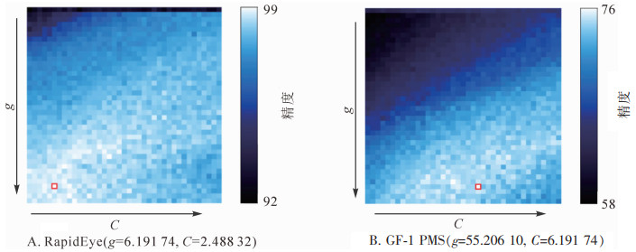 利用SVM模型中的网格搜索法,寻得的RapidEye和GF-1遥感影像的最优参数(g,C)如图 3所示。图 3右边柱状部分为图例,表示最低精度和最高精度的值。观察分析图 3可知:g值较小和C值较高时,精度值较高。