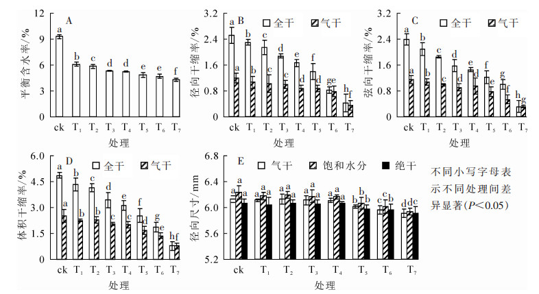 试片为饱和水分的湿材,尺寸为10 mm × 10 mm × 6 mm,取9块·处理-1。用百分表测量装置测量湿材径向和弦向的尺寸,计算体积;置于(20±2)℃、相对湿度(65±5)%的恒温恒湿箱中至气干,测量气干时径向、弦向的尺寸并计算体积;最后放入烘箱烘至全干,测量全干时径向、弦向尺寸并计算体积。经计算得到径向和弦向的全干缩率、气干干缩率及体积的全干缩率和体积的气干干缩率。径向或弦向全干缩率Bmax=(Lmax-L0)/Lmax×100%。其中:Lmax(mm)为湿材试片径向或弦向靠竹青、竹黄处尺寸的均值,L0(mm)为试片全干时径向或弦向靠竹青、竹黄处尺寸的均值。径向或弦向气干干缩率BW=(Lmax-Lw)/Lmax×100%。其中:Lw(mm)为试片气干时径向或弦向靠竹青、竹黄处尺寸的均值。体积全干缩率βVmax=(Vmax-V0)/Vmax×100%。其中:Vmax(mm3)为试片湿材时的体积,V0(mm3)为试片全干时的体积。体积气干干缩率βVw=(Vmax-Vw)/Vmax。其中:Vw(mm3)为试片气干时的体积。