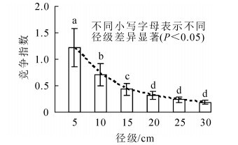 从图 4可知:小径级油松受侧方挤占和上方遮盖比例相差不大,随着径级的增大,侧方挤占逐渐主导竞争,大径级油松几乎不受上方遮盖影响。油松所受平均竞争强度随径级增大而减少,上方遮盖随径级的增大而迅速减小。除5~10 cm径级外,油松种间平均竞争强度均小于种内。对油松对象木的竞争指数作径级分析,因其径级竞争指数未满足方差齐性检验,故选用非参数检验进行分析。非参数检验的Kruskal-Wallis检验结果表明油松径级间竞争指数存在显著差异(P<0.05),由图 5可知:油松胸径>20 cm,各径级间差异均不显著,具体表现为20~25 cm与25~30 cm,20~25 cm与≥30 cm及25~30 cm与≥30 cm径级间差异不显著,其余各径级间差异均显著(调整后P<0.05)。这表明油松胸径<25 cm时,其竞争指数随胸径的增大而显著减少,但胸径≥20 cm的各径级油松个体竞争指数随径级变化不显著,占油松总体的25.71%。