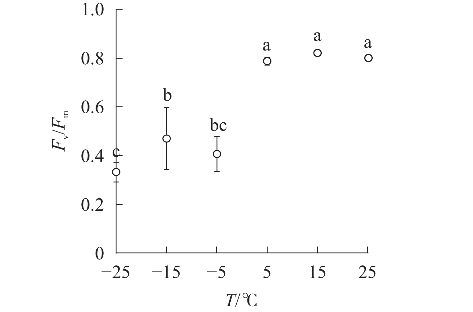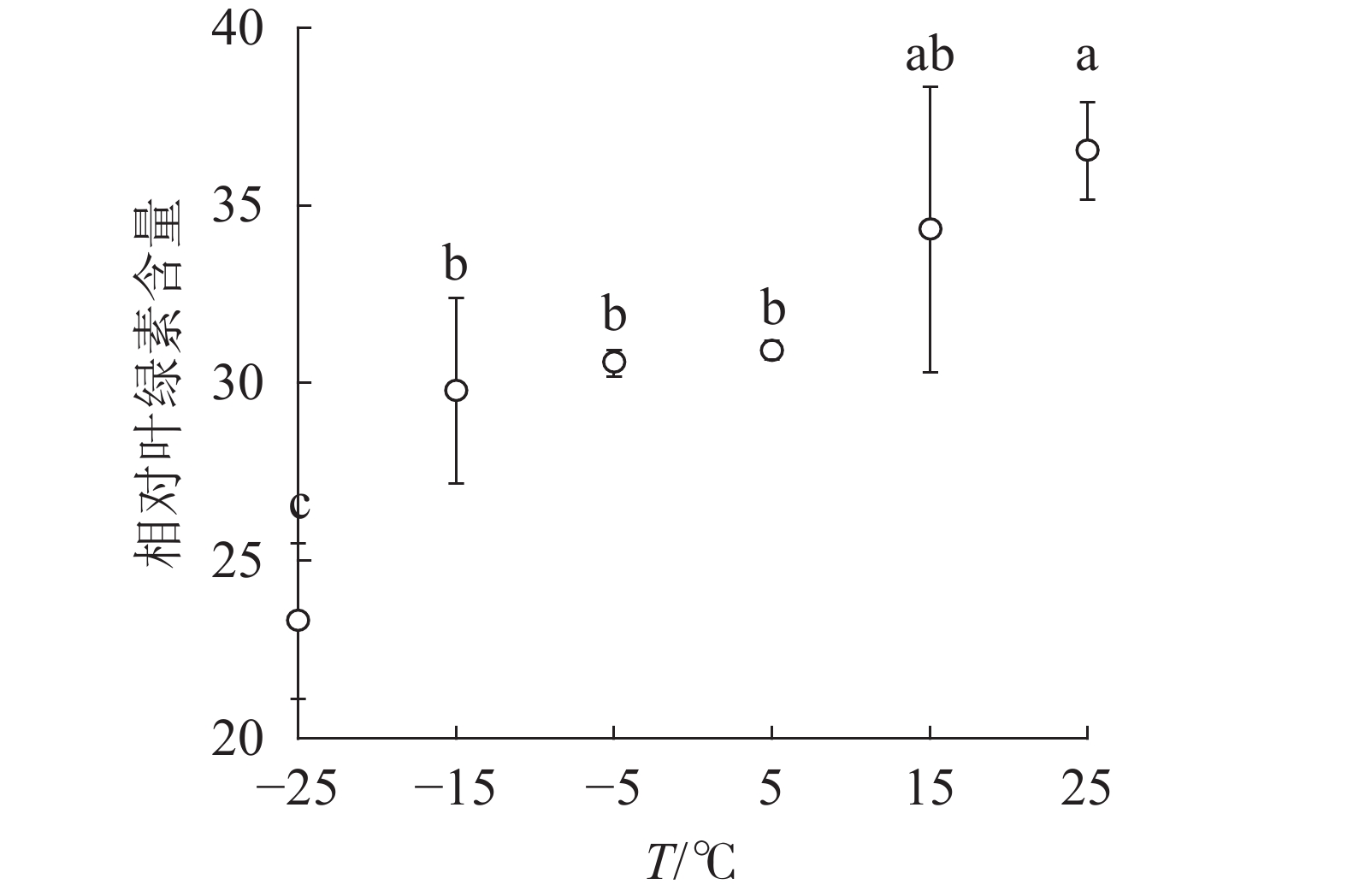 由图1可知:15和5 ℃时相对叶绿素含量无显著变化,−5 ℃时开始显著下降,−25 ℃时极显著降低,与对照相比降低了63.8%。表明≤−5 ℃的低温环境会导致南极假山毛榉叶片相对叶绿素含量显著降低。