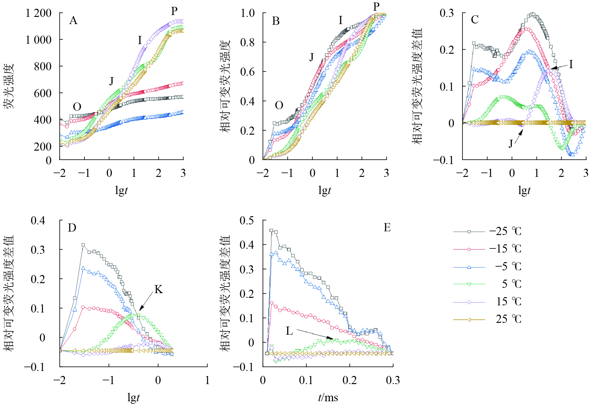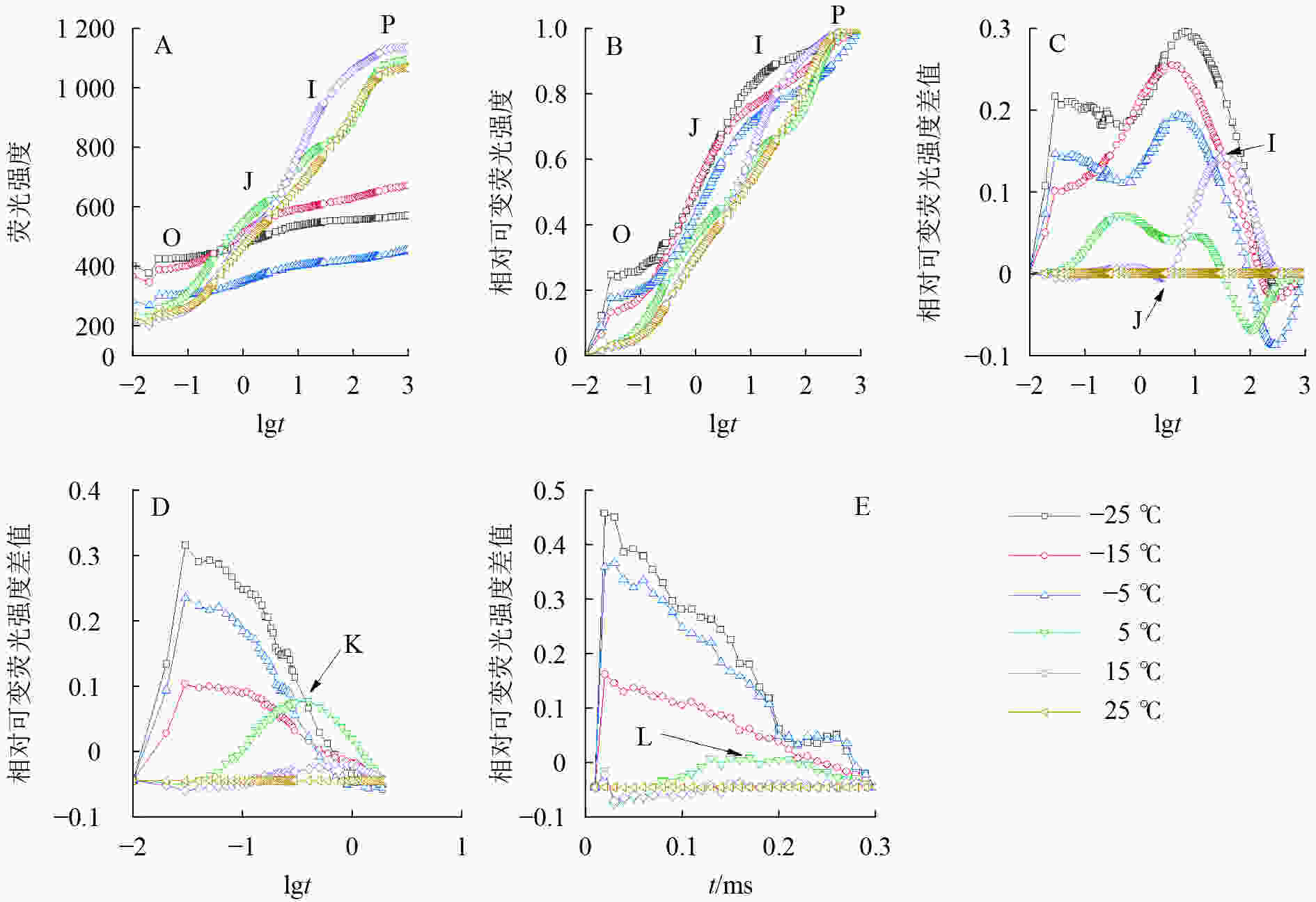 由图2可知:5、15和25 ℃处理下OJIP曲线出现O、J、I、P各相(图2A、B),表明这些温度下电子传递链运转正常;−5、−15和−25 ℃的OJIP曲线较为平缓(图2A),缺少J相和I相(图2B)。将标准化的各处理曲线与ck相减,可见J相和I相合并,并且在光照极短时间(约0.03 ms)出现1个较大峰(图2C),表明电子传递链严重受阻。OJIP曲线在5 ℃出现典型的K点(图2D)和L点(图2E),表明PSⅡ供体侧和PSⅡ反应中心受损。