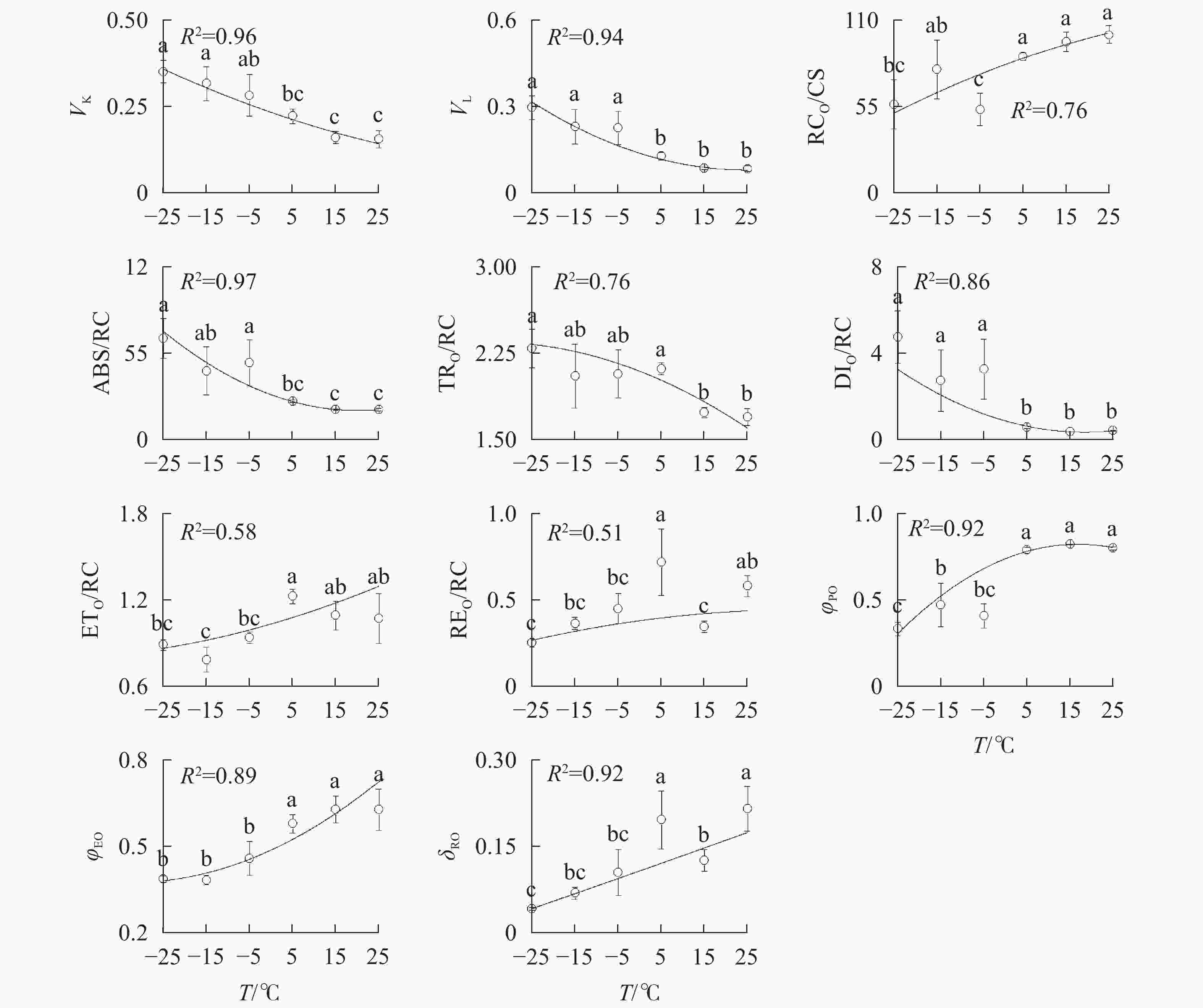 本研究中,当温度从25 ℃降低到15 ℃时,相对叶绿素含量、OJIP曲线、快速叶绿素荧光诱导动力学测量参数和IBR没有显著变化,说明15 ℃的环境温度对南极假山毛榉PSⅡ光化学活性的扰动轻微。当温度降低到5 ℃时,OJIP曲线出现K点和L点,PIABS开始显著下降,表明此阶段的低温主要对PSⅡ供体侧和反应中心构成胁迫,即放氧复合体(OCE)出现损伤,PSⅡ各单位之间的能量流通不畅。从−5 ℃降至−25 ℃,相对叶绿素含量显著降低,PSⅡ供体侧受损加剧;进入电子传递链的电子减少,引起电子传递效率下降;光反应的激发能不能及时传递到PSⅡ受体侧而大量积累,最终造成PSⅡ各单位之间的能量流通混乱,部分能量只能以热能的形式耗散。