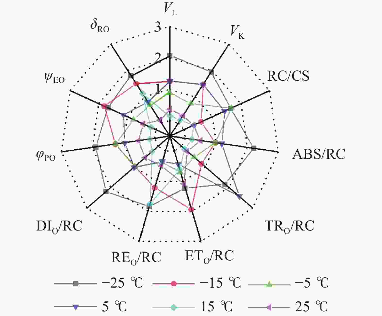 、VL、ABS/RC、DIO/RC、TRO/RC的拟合曲线持续上升,其余参数的拟合曲线持续下降(图3),因此对VL 、VK、ABS/RC、DIO/RC、TRO/RC的标准后数值取正值,其余参数取负值,绘制星状图(图6)并计算IBR(图7)。与对照相比,IBR在5、−5和−15 ℃时显著增加,−25 ℃极显著升高。对IBR作回归分析显示:22 ℃为IBR拐点,高于或低于此温度均导致IBR升高;表明IBR与温度胁迫程度呈正相关,南极假山毛榉叶片对光能的吸收利用效率最佳值在22 ℃,≤5 ℃的低温会对南极假山毛榉PSⅡ光化学活性造成胁迫。 -