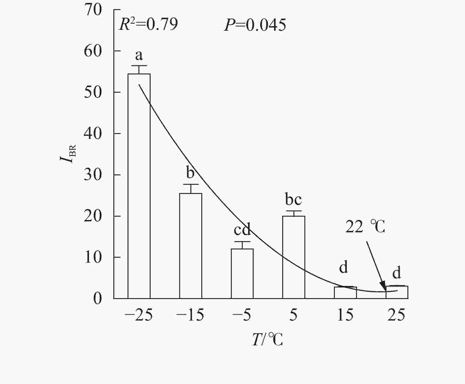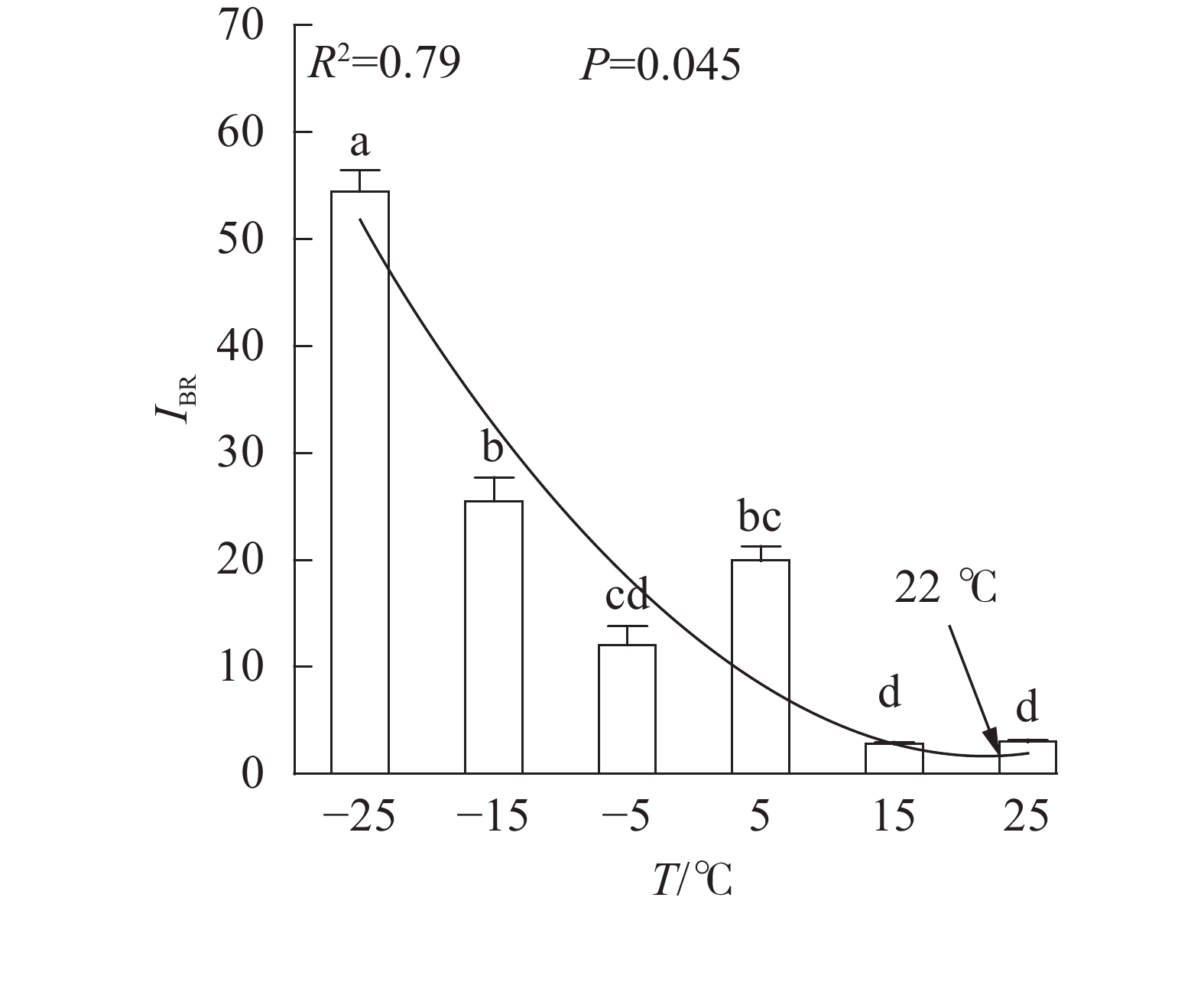 PIABS不同,IBR与相对叶绿素含量亦存在极显著负相关关系,可能预示IBR对低温胁迫的反映更具有广泛性。 多项研究显示,5 ℃的低温会引起Fv/Fm和PIABS显著降低[6-8,11];本研究发现:高于5 ℃时南极假山毛榉叶片的Fv/Fm和IBR无显著变化,高于15 ℃时PIABS无显著变化,表明南极假山毛榉叶片PSⅡ的温度适应性强,这可能是南极假山毛榉耐寒性强的生理基础之一。研究还发现:冰冻胁迫对PSⅡ的光吸收能力抑制明显,预示在南极假山毛榉的生长季需要预防零度以下的寒潮侵袭。STECCONI等[24]发现南极假山毛榉的最适生长温度为18.5 ℃/7.0 ℃(昼/夜),回归分析显示IBR的最小值出现在22 ℃,这一温度与上述研究结果仍有差距,可能与低温处理时间,以及参与计算IBR的参数种类有关,还需进一步探究。