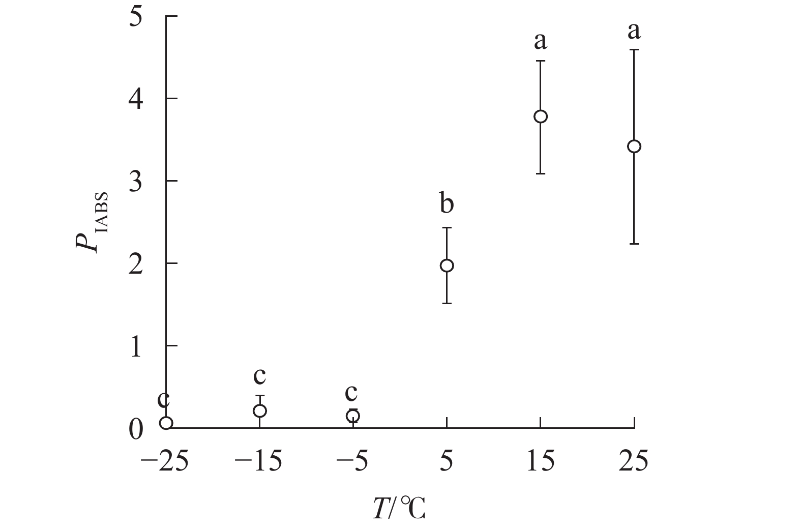 PIABS显著低于对照,−5、−15和−25 ℃时, PIABS接近于0,表明≥15 ℃的环境温度对南极假山毛榉叶片的光能吸收无显著影响,≤5 ℃时开始出现低温胁迫,≤−5 ℃会造成严重的冰冻胁迫(图5)。 -
