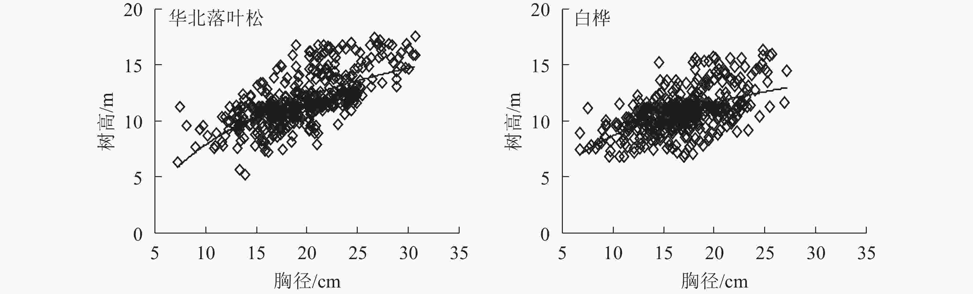 图1为不同树种胸径与树高的关系。华北落叶松和白桦的树高分别为4~18和6~16 m,胸径分别为6~32和6~28 cm。