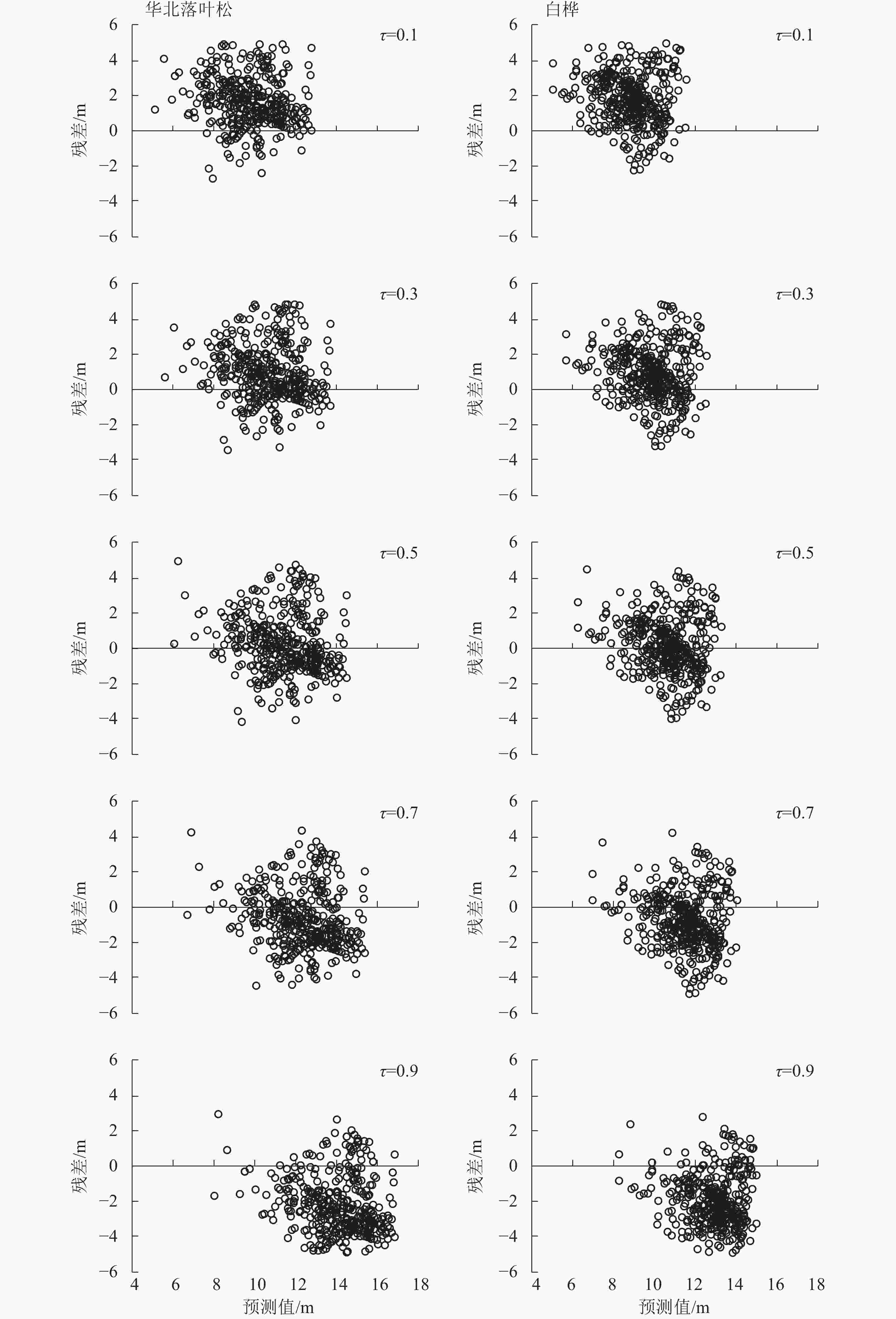 在构建树木生长及生物量预测模型中,包含哑变量模型具有更高的预测精度[22,25,31-32]。本研究在华北落叶松与白桦针阔混交林中,基于非线性分位数回归构建的包含哑变量树高与胸径的关系模型,其精度高于传统回归预测模型,这与人工林最大密度线确定[21]及树高与胸径关系模型[20]的研究结论相一致,表明非线性分位数回归较传统回归方法更加稳定,可用于人工林和混交林立地潜在生产力的评价。