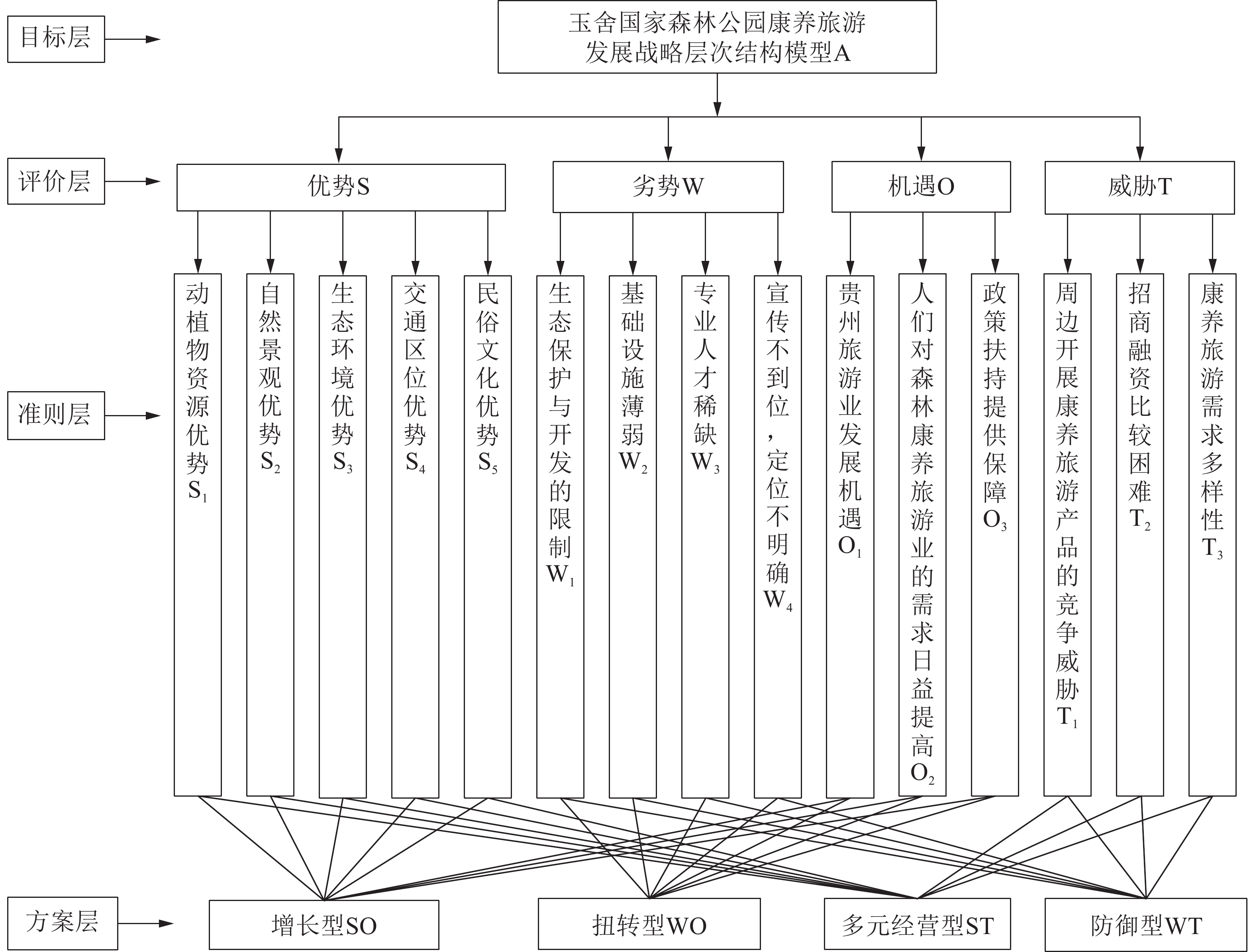 根据对玉舍国家森林公园康养旅游发展内外部影响因素分析,构建了玉舍国家森林公园康养旅游发展战略层次分析模型(图1)。