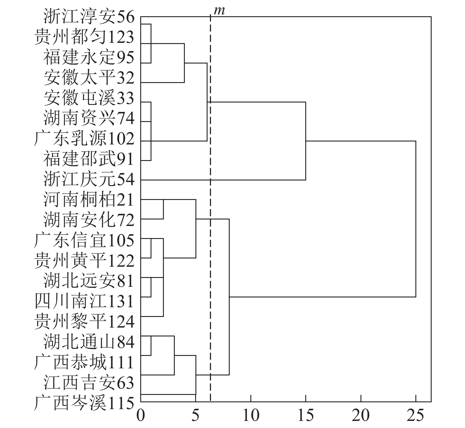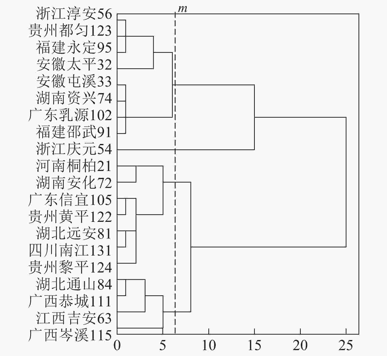 基于上述结果,利用马尾松总有机碳质量分数、树干植硅体质量分数、植硅体封存有机碳质量分数等指标的均值对20个马尾松种源进行Q聚类分析(图3)。以图中m线为阈值可以将20个种源划分为4类,第1类为湖北通山84、广西恭城111、江西吉安63以及广西岑溪115,此类马尾松种源总有机碳质量分数为472.9~483.5 g·kg−1,植硅体封存有机碳质量分数最高,为204.5~210.2 g·kg−1,植硅体碳质量分数也整体相对较高,为0.070~0.107 g·kg−1,标准株马尾松树干植硅体碳储量为8.08~31.58 g·株−1,其中广西岑溪115(31.58 g·株−1)标准株树干植硅体碳储量最高;第2类马尾松种源包括河南桐柏21、湖南安化72、广东信宜105等7个种源,此类马尾松种源总有机碳质量分数为469.1~489.6 g·kg−1,树干植硅体封存有机碳质量分数为177.2~194.1 g·kg−1,植硅体碳质量分数为0.058~0.121 g·kg−1,标准株马尾松树干植硅体碳储量为4.83~20.23 g·株−1;第3类为浙江淳安56、贵州都匀123、福建永定95、安徽太平32等8个种源,这类马尾松种源总有机碳质量分数为467.6~485.9 g·kg−1,树干植硅体封存有机碳质量分数为147.6~172.4 g·kg−1,植硅体碳质量分数为0.049~0.128 g·kg−1,标准株树干植硅体碳储量变动为5.45~16.03 g·株−1;浙江庆元54为第4类马尾松种源,树干植硅体碳封存能力最差,总有机碳质量分数为484.0 g·kg−1,植硅体封存有机碳质量分数为126.8 g·kg−1,植硅体碳质量分数为0.070 g·kg−1,标准株树干植硅体碳储量为13.64 g·株−1。