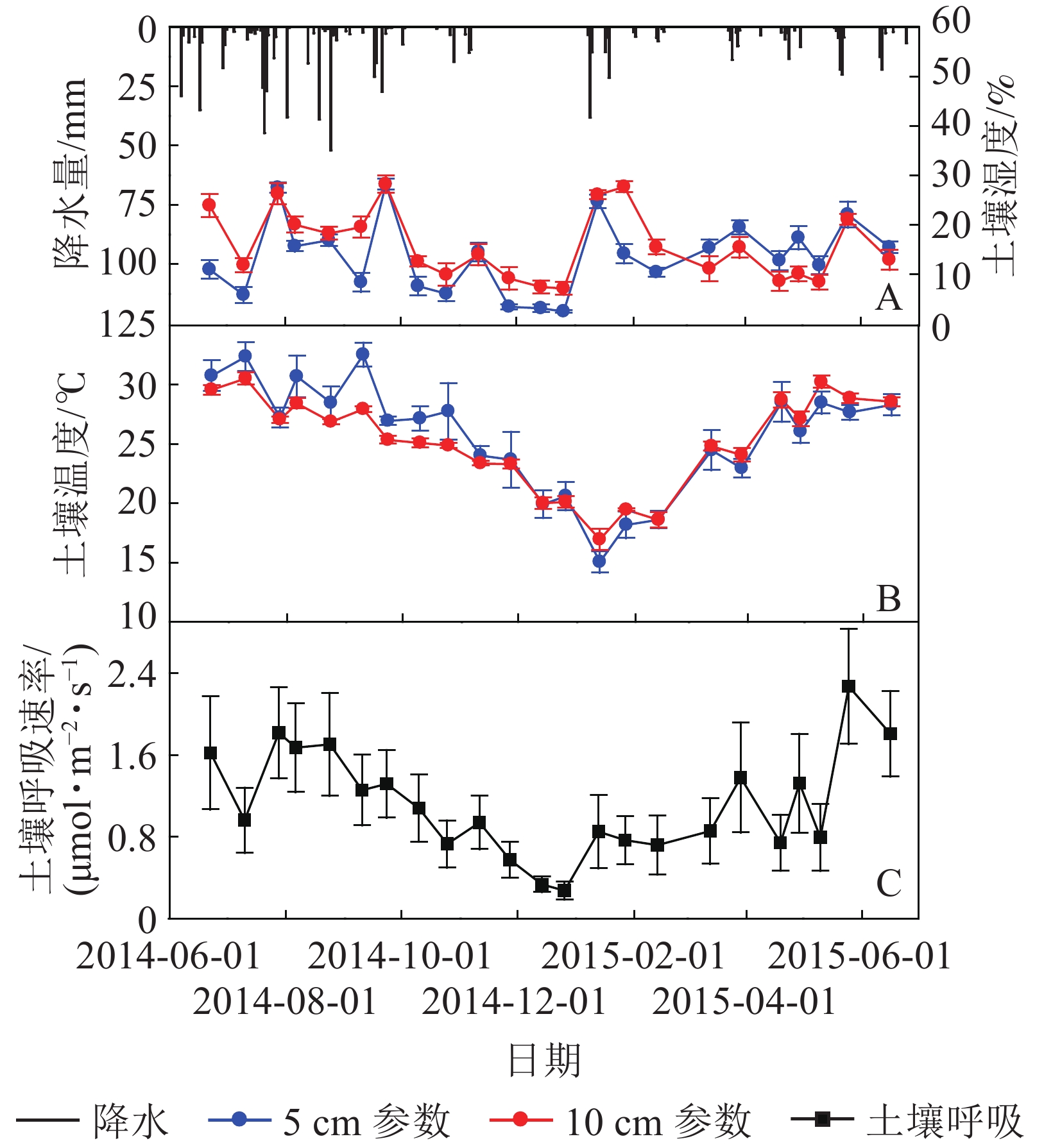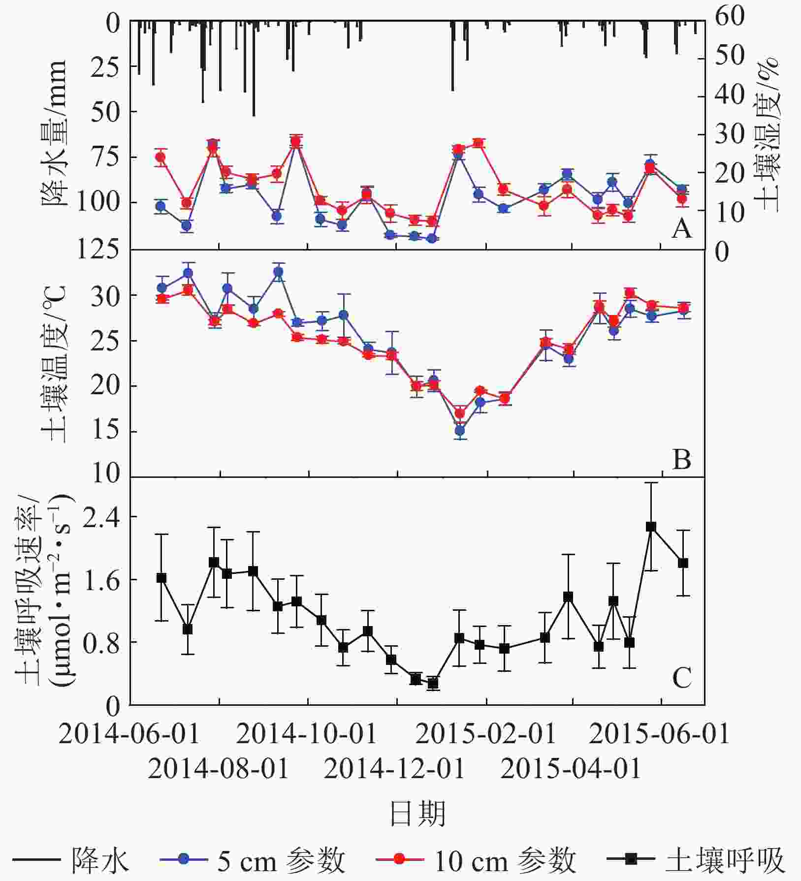环境因子测定:测定土壤呼吸的同时,采用长杆温度计在气室顶部小孔插入测定气室温度,在采样桶周围10 cm内埋设HOBO温度采集器,测定5、10 cm处土壤温度。采用TDR 100土壤水分速测仪测定采样桶周边0~5、0~10 cm土壤体积含水量,简称5、10 cm土壤湿度。