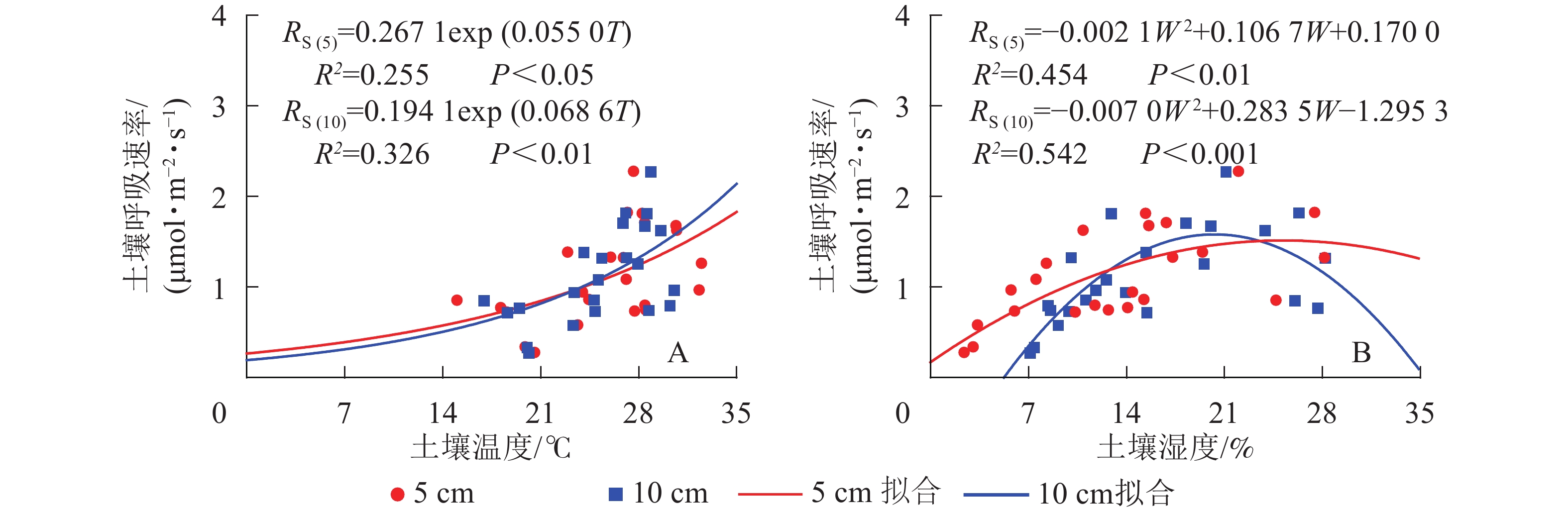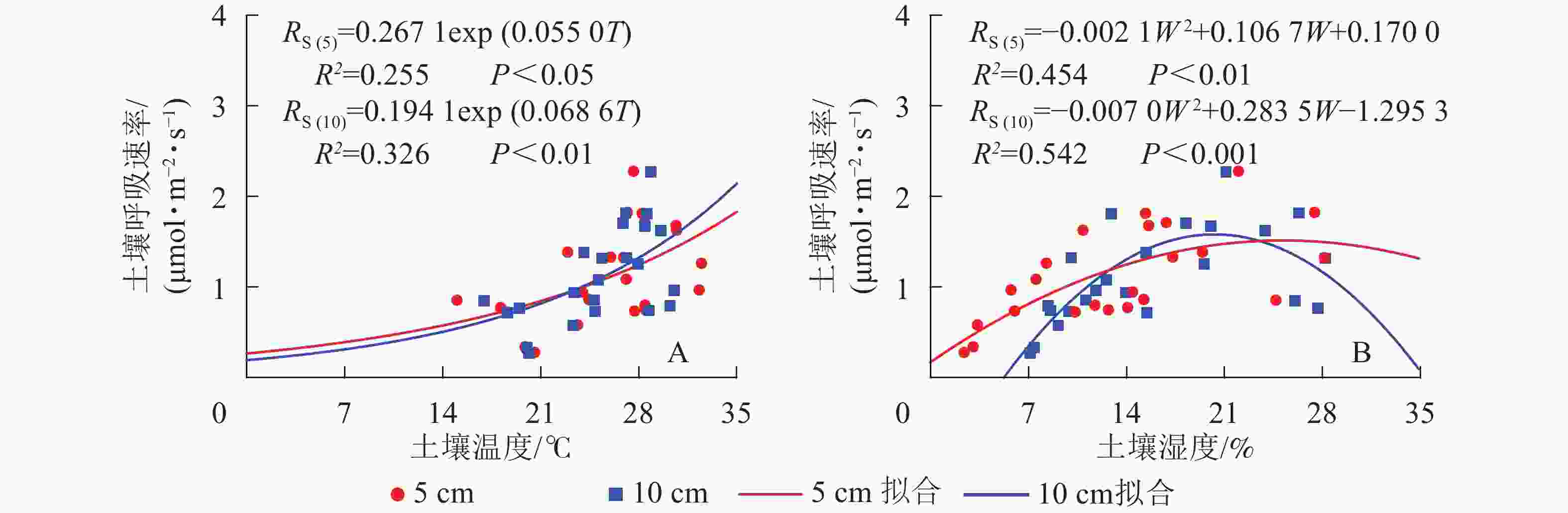 土壤呼吸速率与5和10 cm处土壤湿度呈现凸型抛物线关系,二者相关性显著(P<0.01)(图2)。湿度过低或者过高都会抑制土壤呼吸速率,其中5 cm处土壤湿度在25.4%时土壤呼吸速率最高,10 cm处土壤湿度在20.3%时土壤呼吸速率最高。