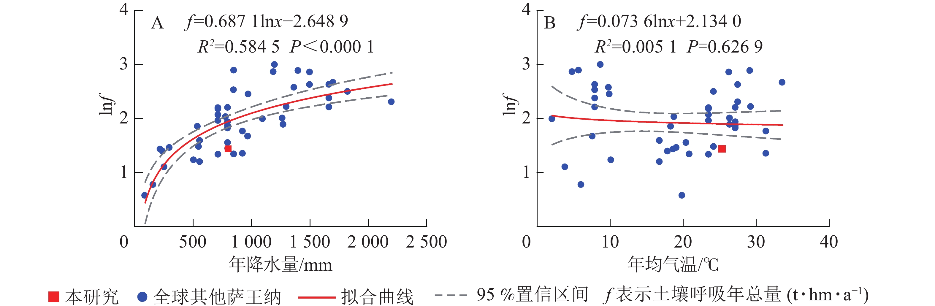 元江干热河谷稀树灌草丛生态系统干季、雨季的土壤呼吸总量分别为1.49和2.71 t·hm−2,土壤呼吸年总量为4.2 t·hm−2·a−1,低于RAICH[55]统计全球9个点得出的全球萨王纳生态系统土壤呼吸6.30 t·hm−2·a−1的均值,也低于本研究统计的全球49个点的均值,与TALMON等[31]在以色列灌丛样地,MILLARD等[18]在美国草地,REY等[32]在西班牙草地和SUN等[33]在南澳大利亚的桉树Eucalyptusspp.林的结果接近,其主要原因是这些生态系统降水量普遍偏低,而土壤呼吸总量与年均降水量相关性显著,因此这些降水量较低的萨王纳生态系统土壤呼吸均较低。