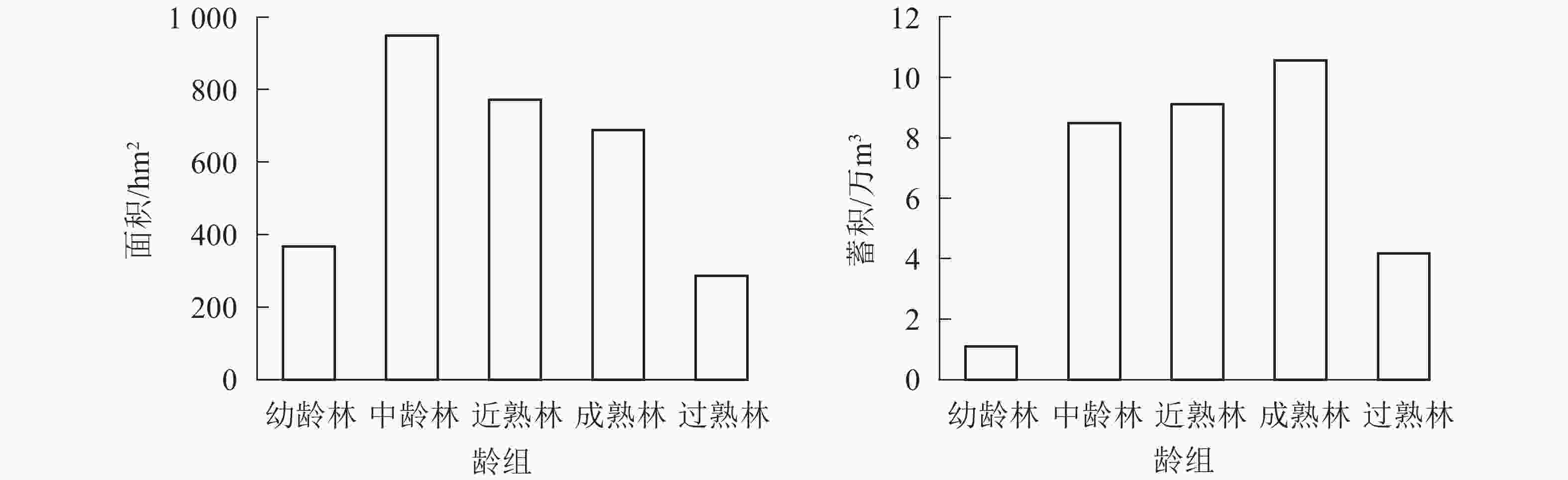 全场用材林面积为3 346.16 hm2、蓄积334 407.5 m3,用材林面积、蓄积按龄组统计如图1所示。现有用材林龄组结构分布很不均匀,面积、蓄积主要集中在中龄林、近熟林和成熟林,其中成熟林蓄积105 662.60 m3,占用材林蓄积总量的31.6%;近熟林蓄积91 118.59 m3,占用材林蓄积总量的27.26%,近期可采伐蓄积较大。