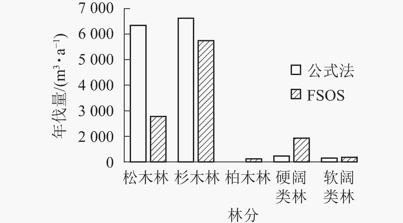 如表2所示:由于基础数据庞大以及数据质量的参差不齐,除柏木林外,决定系数R2均超过0.8,部分林分曲线拟合精度能达0.9。拟合生长曲线可用以预测林分的生长和演变,揭示森林的未来发展。基于森林当前的生长蓄积和林分生长曲线,模型进行后续运行,计算不同林分的合理年伐量,并最终生成用材林主伐经营方案。用材林主伐方案结果显示:全场用材林年伐量为9 073.51 m3,年伐面积76.35 hm2。其中松木林年伐量2 077.48 m3,杉木林5 528.49 m3,柏木林152.78 m3,硬阔类林1 081.60 m3,软阔类林212.91 m3(图2)。平均采伐年龄40 a,平均采伐木材量109.27 m3。2种方法对比,FSOS计算的年伐量明显小于公式法计算结果。不同林分类型结果对比如图2所示,差异主要体现在松木年伐量的计算结果。松木林早期多为纯林,经过多年经营,目前均以针阔混交林的形式存在,公式法难以将松木准确地从混交林中区分出来,导致计算结果偏大。