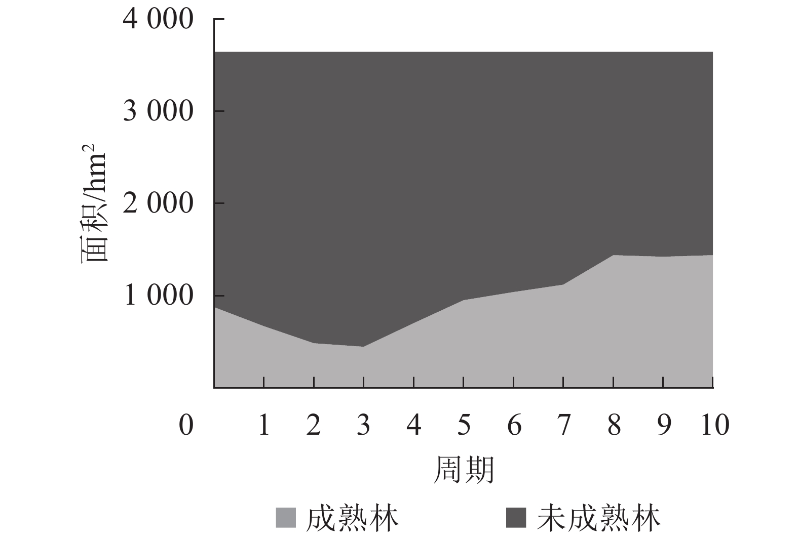 如图3所示:按成熟情况分组,可采伐林地成熟林面积经过早期的采伐,在第3期达到最低值,之后由于年伐量的减小,并且伴随着未成熟林分的生长成熟,成熟林面积得到补充。到了规划后期,成熟林和未成熟林面积趋于稳定,成熟林面积占总面积的40.94%,林分的龄组分布趋于理想状态,龄组结构变动也趋于稳定。