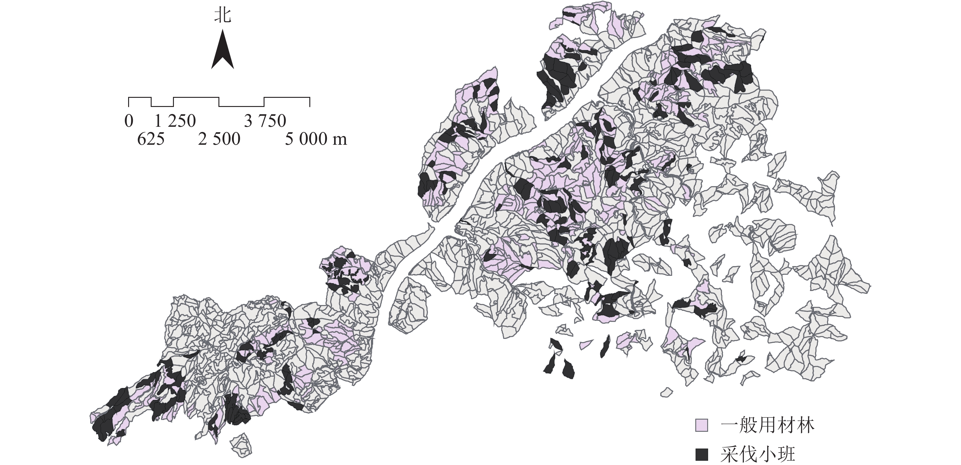 FSOS模型具有地图功能,能将小班与地形图结合,将每个周期的采伐分布精准定位到具体的小班地块,并将其展示在地图上,保证应用的精准性,可直接指导营林作业,便于森林经营管理。图5是2018–2028年建德市林业总场用材林采伐小班的分布情况,清楚地展示了未来需要进行采伐作业的小班地块;利用模拟退火算法迭代优化后的采伐斑块,其分布既便于集中安排作业,节省成本,又避免集中采伐面积过大影响景观。